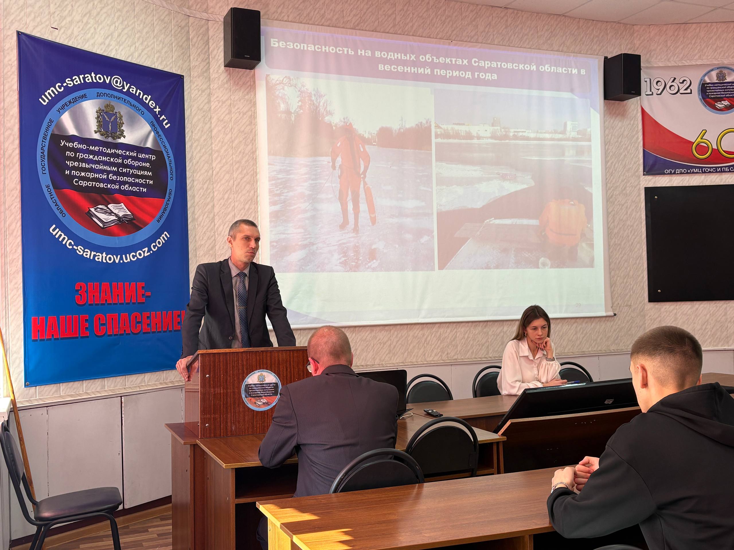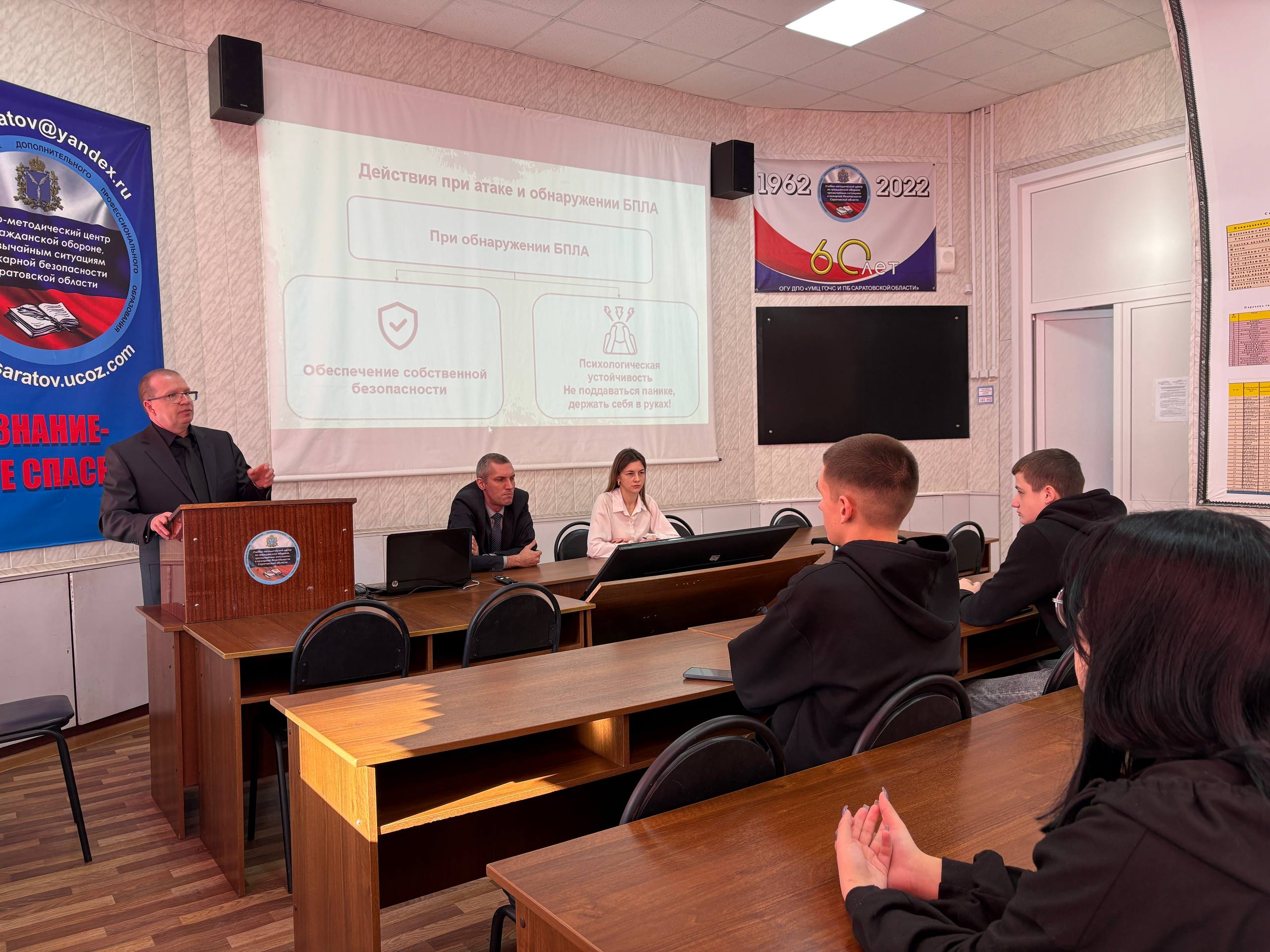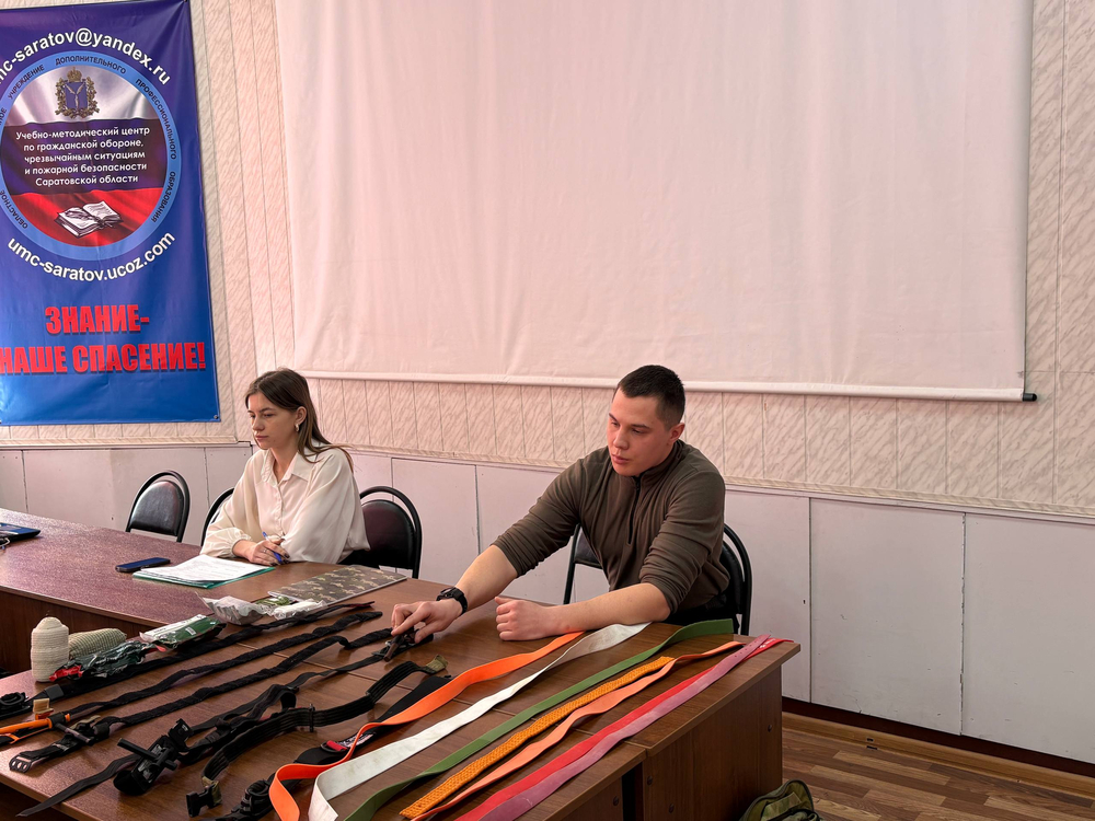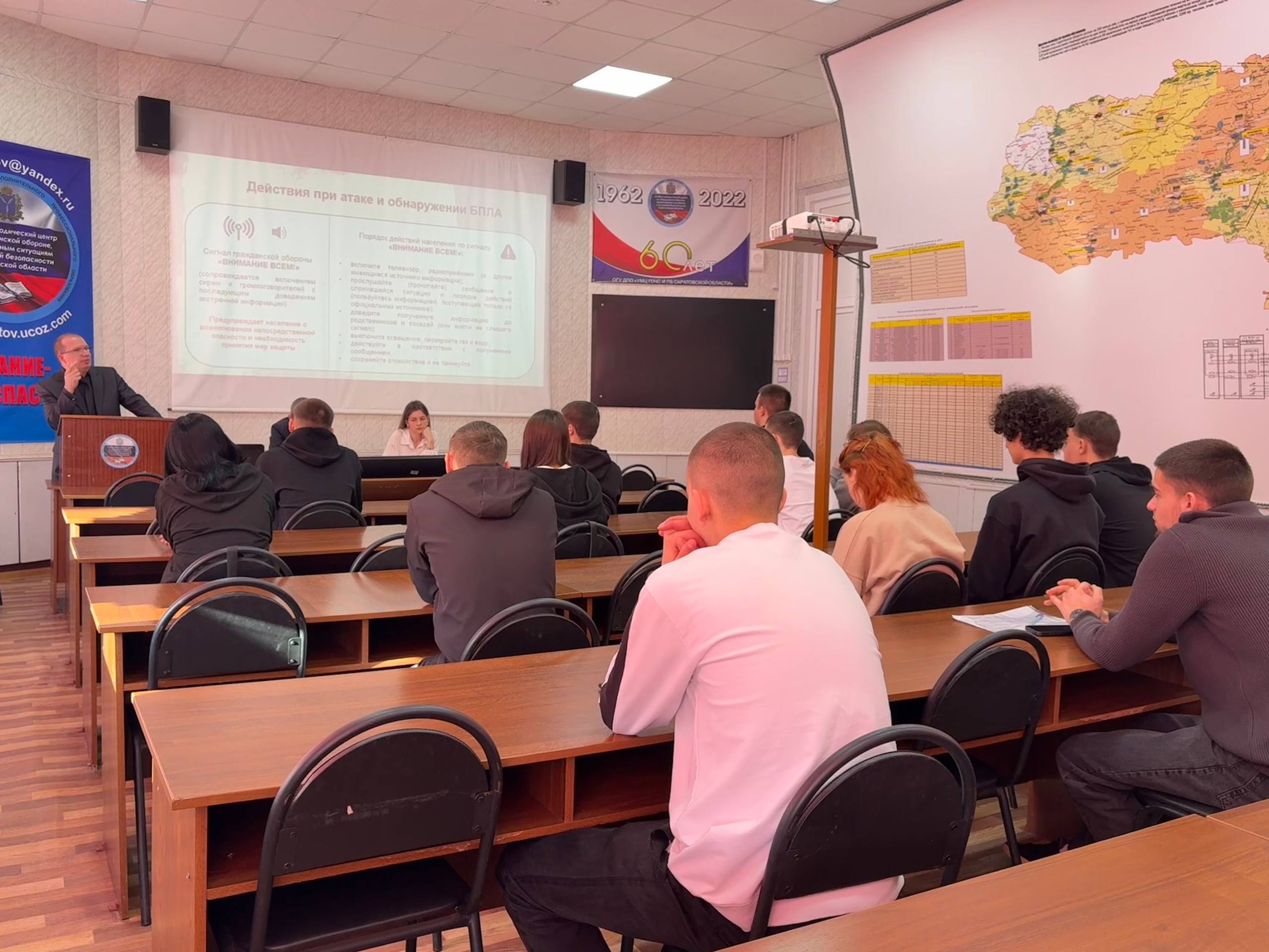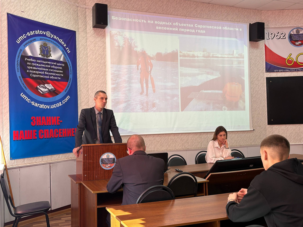 Преподаватели учебного центра Яковлев Р.Б. и Подковыркин М.С. довели информацию, как действовать по сигналам «Внимание всем!», разобрали с присутствующими алгоритмы поведения при атаке беспилотных летательных аппаратов, рассказали про применение средств коллективной и индивидуальной защиты, о мероприятиях при эвакуации населения, а также о безопасности на водных объектах Саратовской области в весенний период.