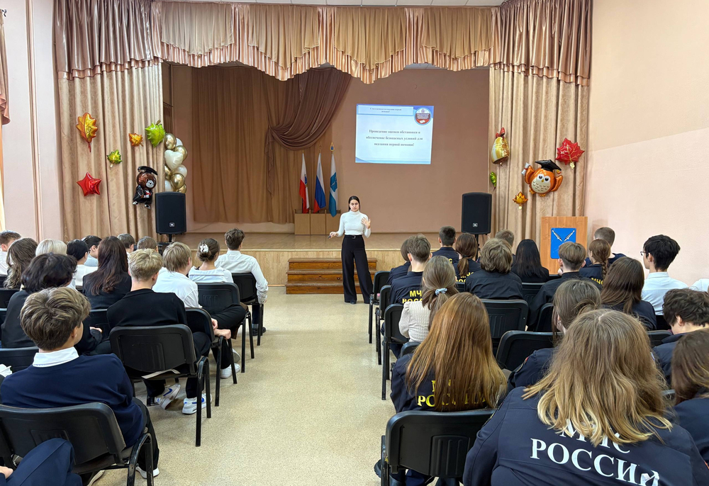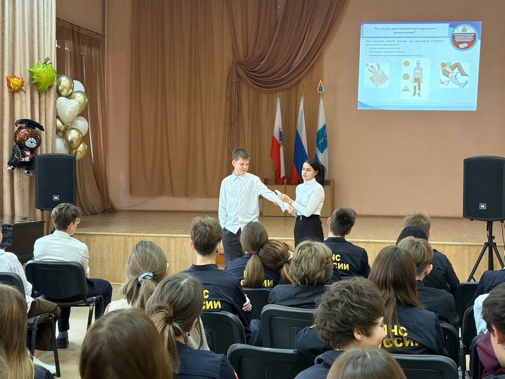 В рамках мероприятия «Безопасный час» специалисты учебного центра провели выездное занятие для учащихся 8-9 классов, в том числе обучающихся по пожарно-спасательному профилю.