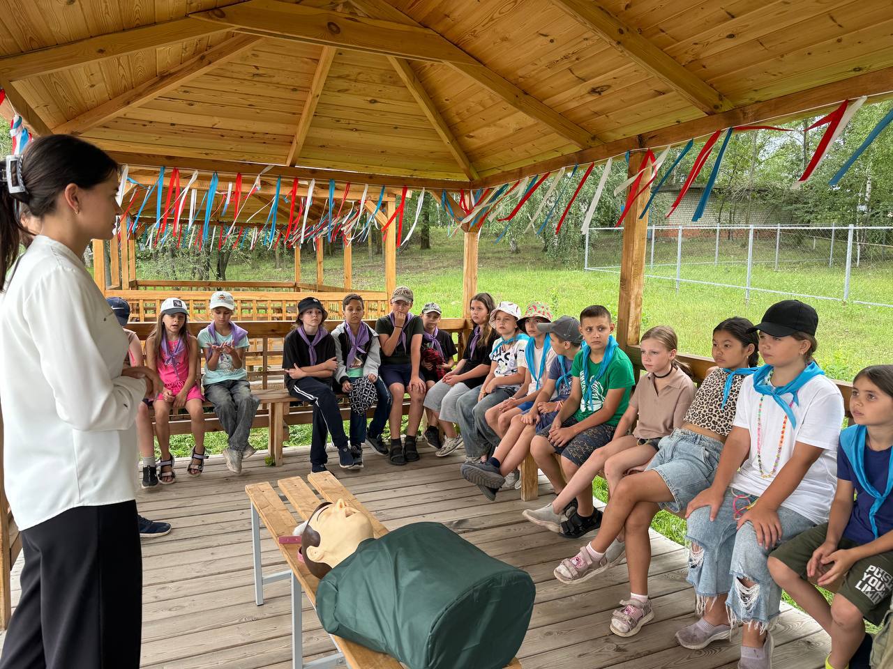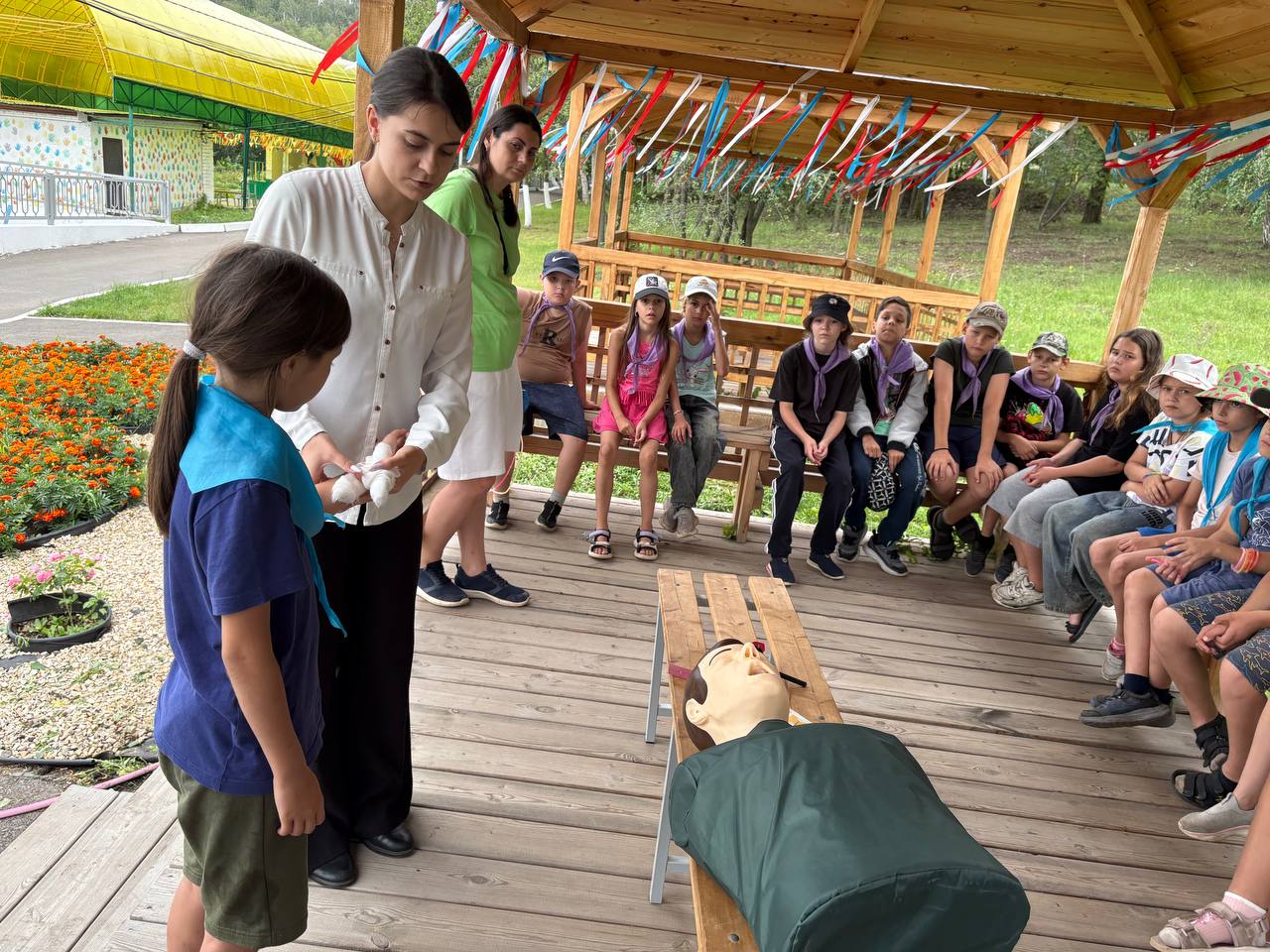 Конакова З.В. объяснила ребятам, что купаться можно только в сопровождении взрослых на специально оборудованных пляжах, рассказала какие опасности подстерегают на воде и показала несколько мероприятий по оказанию первой помощи: проведение сердечно-легочной реанимации, наложение давящей повязки и кровоостанавливающего жгута; прием Геймлиха, проводимый при нарушении проходимости верхних дыхательных путей.