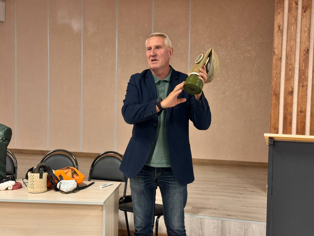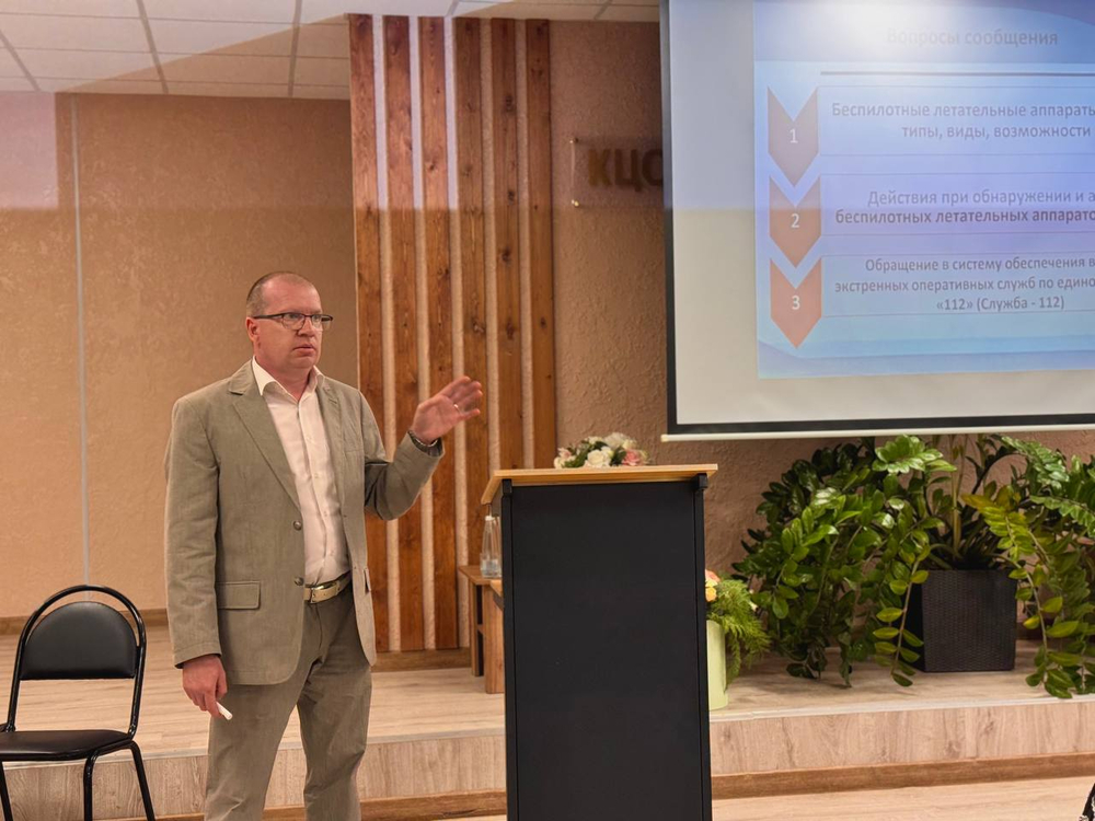 Преподаватели Третьяков М.Д. и Яковлев Р.Б. рассказали присутствующим о системе защиты населения и территорий РФ, сигналах оповещения ГОЧС, способах защиты населения, действиях населения при атаке БПЛА, а также о работе «Системы – 112».