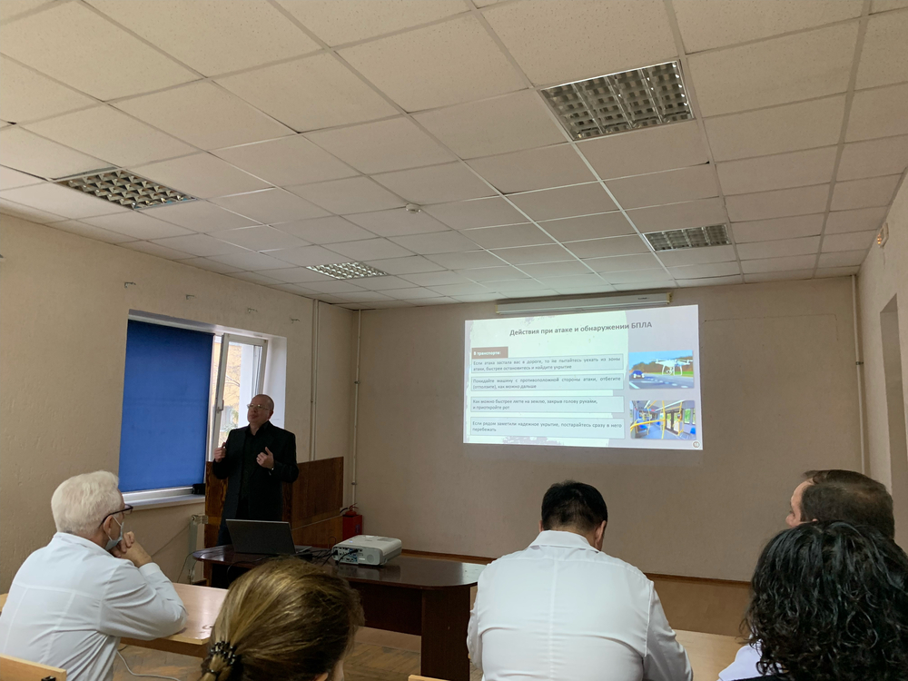 В рамках мероприятия специалист учебного центра Яковлев Р.Б. разъяснил сотрудникам учреждения основные требования безопасности и порядок действий при получении сигнала об угрозе атаки БПЛА. Помимо этого были рассмотрены принципы работы системы «112» — единого номера вызова оперативных служб, а также потенциальные риски, связанные с атаками БПЛА, и меры предосторожности при их обнаружении.