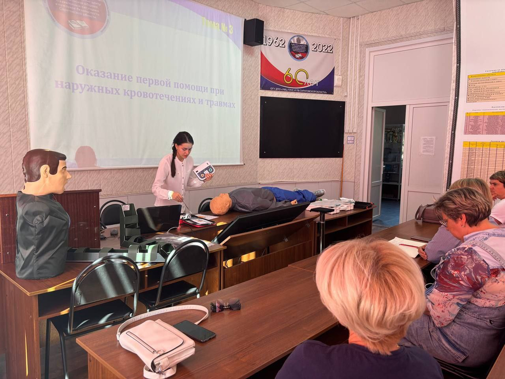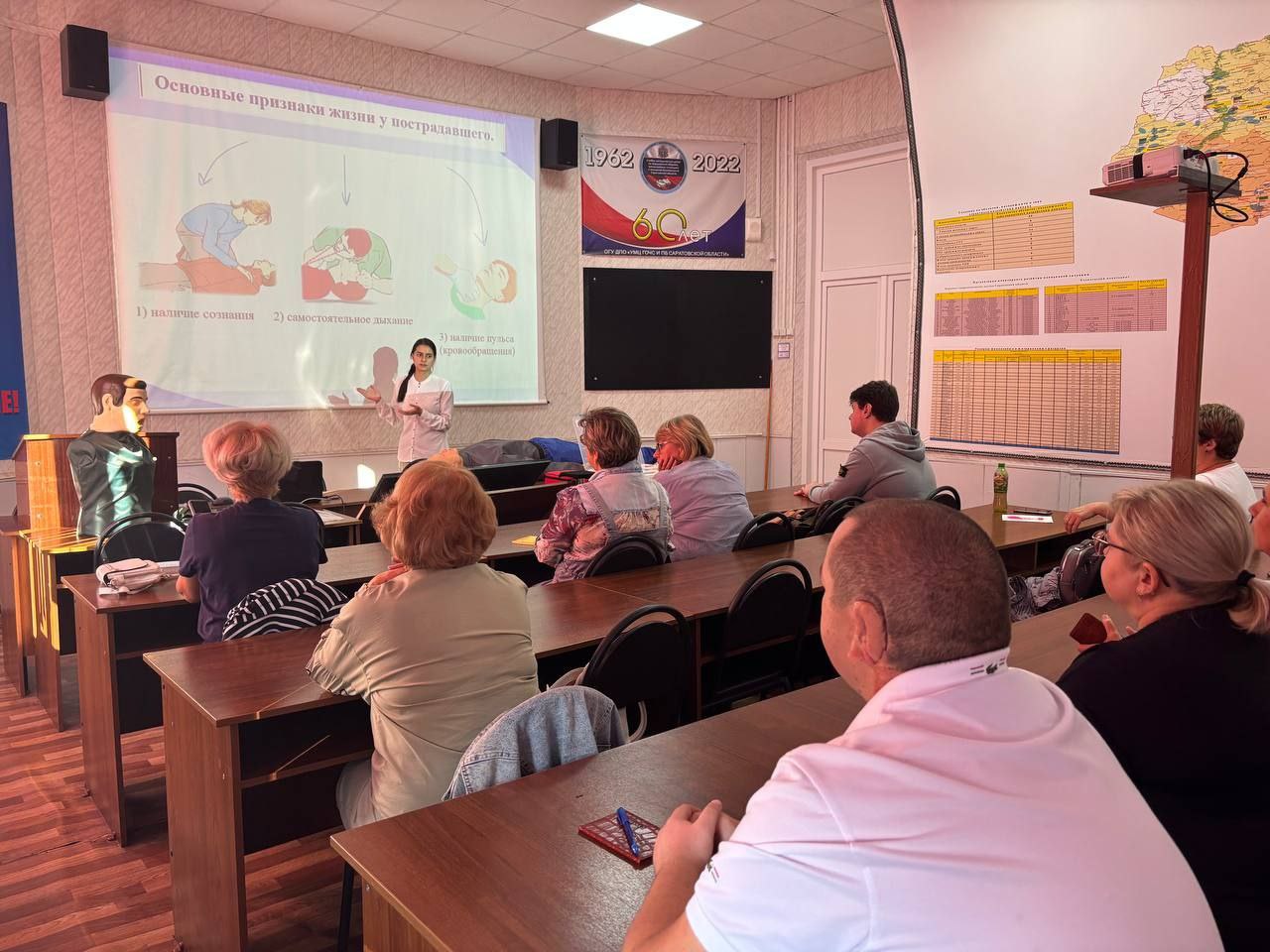 В практической части занятия участники отработали приёмы сердечно-лёгочной реанимации, научились правильно накладывать повязки и останавливать кровотечения с использованием различных средств.